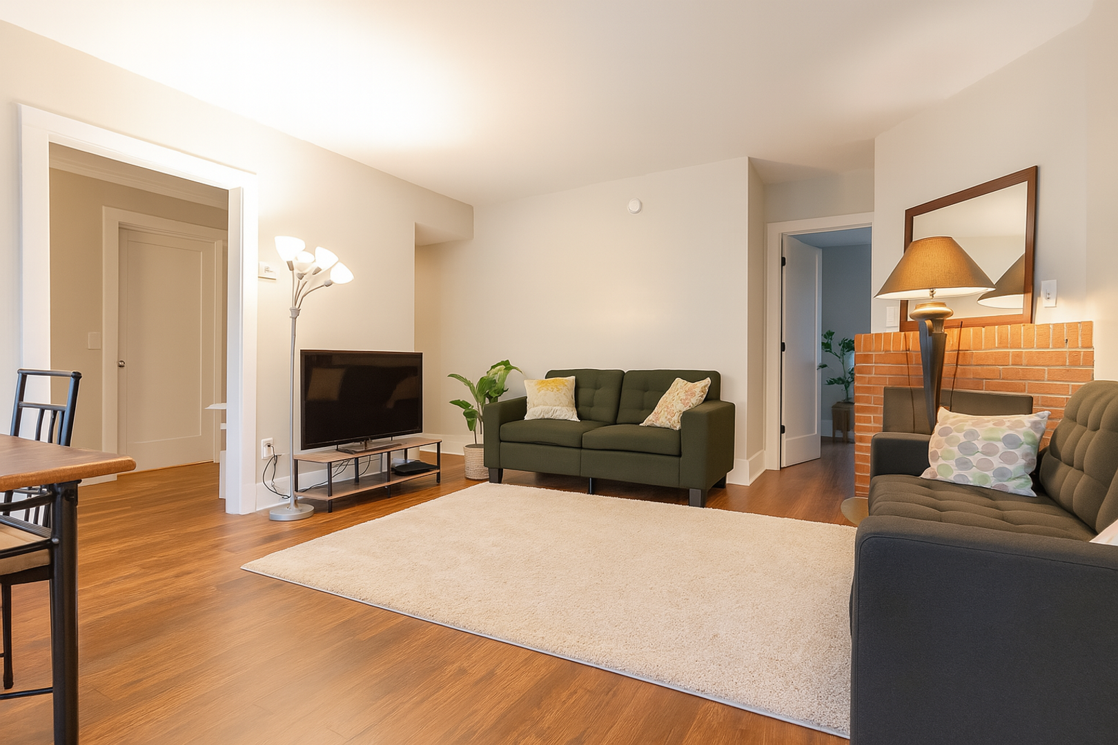 living room, and a modern kitchen with stainless steel